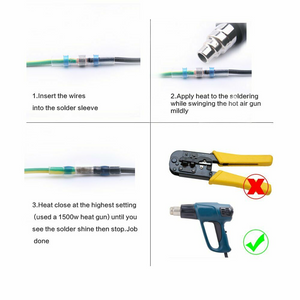 • 14-16 AWG 1.5 mm² heat shrink connectors,An easy one step connection of wires, soldered, insulated and sealed